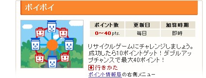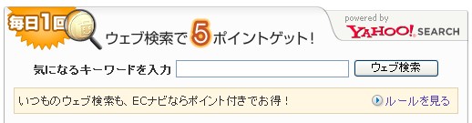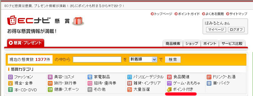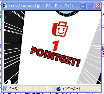 1.ウェブ検索で5ポイントゲット! なんとウェブ検索だけで毎日5ポイントも貰えてしまいます。1週間で35ポイント、1ヶ月で155ポイント、1年で・・・ついつい計算してしまいますが(笑)この5ポイントは大きいですね! 2.ポイポイ カンタンなゲームに参加してポイントゲット!ペットボトルを青いかごに入れるだけのシンプルなゲーム。タイミングを計るのは難しいのでほぼ運だめしです。赤いカゴに入れると残念・・・0ポイントというややシビアなところもあります。ダブルアップもリスクが高いかもしれません。10ポイント取れたらいいな~っていう気楽な気持ちで毎日やっています♪ 3.おみくじ おみくじのバナーをクリックするだけというボーナス的コーナー。しかもポイポイが当たりにくい分こちらは割と当たりますよ。今日も小吉があたりました♪ ◎始めたばかりのサイトで、お友達も少ない状況です。同じお小遣いサイト様の相互リンクを募集しています。是非お友達になってください^^一緒にお小遣い増やしましょう。 ◎励みになりますのでブログランキングの応援クリックをお願いします。 ↓こちらにクリック↓ ![]() ↓こちらもクリックをお願いします タダからコツコツお小遣い!こんばんは、はみるとんです。前回、ECナビは比較的クリックで貯まると言いましたが、今回からどれぐらい貯まるのかを詳しく紹介していきます。