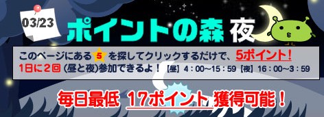 タダからコツコツお小遣い!こんばんは、はみるとんです。今回からげん玉の基礎的な稼ぎ方について紹介していきます。 まずはコレ。ポイントの森。ポイントをもらうには指定された場所をクリックするだけ!朝と夜だけで10ポイント。最も簡単なポイント取得方法です。 今日はまだ取得していませんので実際に取得してみようと思います。 トップページを開くとサイトの真ん中あたりにこのようなバナーがあります。 ↓(下の写真はクリックすると拡大します。) クリックして先に進むと ここに書かれているようにこのページにある☆5を探してクリックするだけでポイントがもらえるのです。 ありました!すぐに見つかりました♪クリックすると・・・ このようにちゃんと教えてくれます。 そしてポント通帳にもこのように載ります。 この日は同じページに↓のようにクリック付のバナーがありましたのでついでにクリックしておきます。 この間わずか1、2分!お手軽です♪ ここから登録すると250ポイントもらえます♪ ◎次回もげん玉の簡単な稼ぎ方を紹介していきます。お楽しみに! ◎励みになりますのでブログランキングの応援クリックをお願いします。 忍者ブログ [PR]