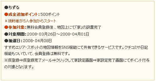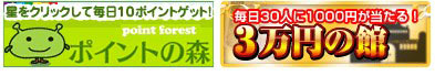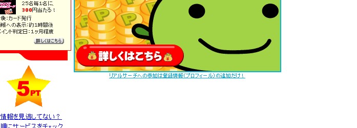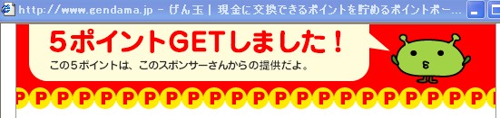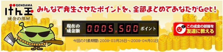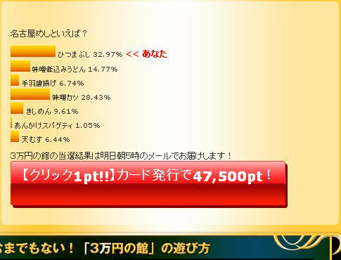 PR タダからコツコツお小遣い!おはようございます、はみるとんです。 今回はげん玉の稼ぎ方基礎編の第3回となります。げん玉の大人気コーナー成金の部屋をご紹介します。 成金の部屋とは、対象期間中(1週間)に対象サービスをクリックしてアクションすると「現在の成金額」に加算されます。このゲームの参加者が多ければ多いほど成金額が増えるんですね。期間終了後に抽選し、みんなで貯めた累積額を、アクションした人達の中から「ひとり」に全部プレゼント! つまり100人が参加すれば100人分のポイントを独り占めにできるチャンスがあるわけです。そしてアクションも無料会員登録など参加しやすいものばかり。 今日もカンタンに説明していきましょう。 参加方法はカンタンです。トップページのこのバナーが目印!成金っぽいですね(笑) ↓ クリックすると現在の成金額が表示されていますよ。 ちょうど今日からスタートのサービスが始まっています。 ↓ 対象サービスのルールはすぐ下に説明があります。 ↓ 挑戦する場合は「成金に挑戦する」バナーをクリックして無料会員登録にすすむのです。 以上、成金の部屋のご紹介でした♪ ◎始めたばかりのサイトで、お友達も少ない状況です。同じお小遣いサイト様の相互リンクを募集しています。是非お友達になってください^^一緒にお小遣い増やしましょう。コメントお寄せください。 ◎次回もげん玉の簡単な稼ぎ方を紹介していきます。お楽しみに! ◎励みになりますのでブログランキングの応援クリックをお願いします。 タダからコツコツお小遣い!おはようございます、はみるとんです。今回はげん玉の稼ぎ方基礎編の第2回となります。3万円の館をご紹介します。 3万円の館とは簡単なアンケートに答えるだけで 毎日30名に現金1000円が当たる というシンプルなものです。それでは、今日もやってみましょう♪ [操作フロー](画像はクリックすると拡大します) ①まずはトップページの真ん中辺りにあるバナーをクリックします。 (昨日、ご紹介したポイントの森の隣にあります。) ↓ ②極めてシンプルなアンケートを選択します。 ここでは、「名古屋めしといえば?」とありますので、「ひつまぶし」を選択しました。 次に「投票して3万円の館に応募」をクリックします。 ③すると、集計結果が出ます。これで応募完了です。簡単でしょう♪ さらに、[クリック1pt!!]とありますので、クリックすると1ptもらえます。確実にもらっておきましょう。 ④当選結果は翌日の朝のメールで発表されます。メールにもクリックポイント(1pt)が付いていますのでお見逃しなく。 翌日の24時をすぎると当選が無効になるので、当選はお早めにチェックしておきましょう。 ◎始めたばかりのサイトで、お友達も少ない状況です。同じお小遣いサイト様の相互リンクを募集しています。是非お友達になってください^^一緒にお小遣い増やしましょう。 ◎次回もげん玉の簡単な稼ぎ方を紹介していきます。お楽しみに! ◎励みになりますのでブログランキングの応援クリックをお願いします。 タダからコツコツお小遣い!こんばんは、はみるとんです。せっかくお小遣いサイト紹介ブログを立ち上げたので新しいお小遣いサイトに登録しようと思いまして、他のサイト様を歩いていくとコミュニケーション型のサイトを発見。